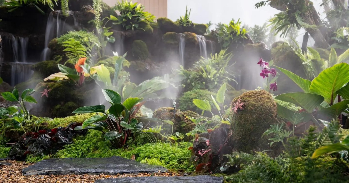 น้ำตกที่ทีมงานของเราสร้างขึ้นในสวน ออกแบบได้ให้สัมผัสกับธรรมชาติในทุกรูปแบบ หินฟองน้ำและหินชั้นสร้างความเป็นสายน้ำป่าเขตร้อน ที่มีลักษณะเป็นหน้าผาสูงและกว้าง เพื่อให้คนในบ้านหรือโรงงานเห็นจากระยะไกล แต่สิ่งที่สำคัญคือ การเลือกใช้ไม้พันธุ์เขตร้อน ไม้ยืนต้นขนาดใหญ่ที่จะมาช่วยสร้างความร่มรื่น และไม้ดอกเขตร้อนสุดวิจิตรเพิ่มความสวยงามและความหลากหลายของสีสัน